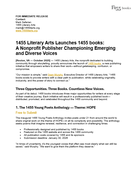 [Reston, VA — November 5, 2025] — 1455 Literary Arts, the nonprofit dedicated to building community through storytelling, proudly announces the launch of 1455 books, a new publishing initiative that empowers writers to share their work—without gatekeeping, confusion, or compromise.