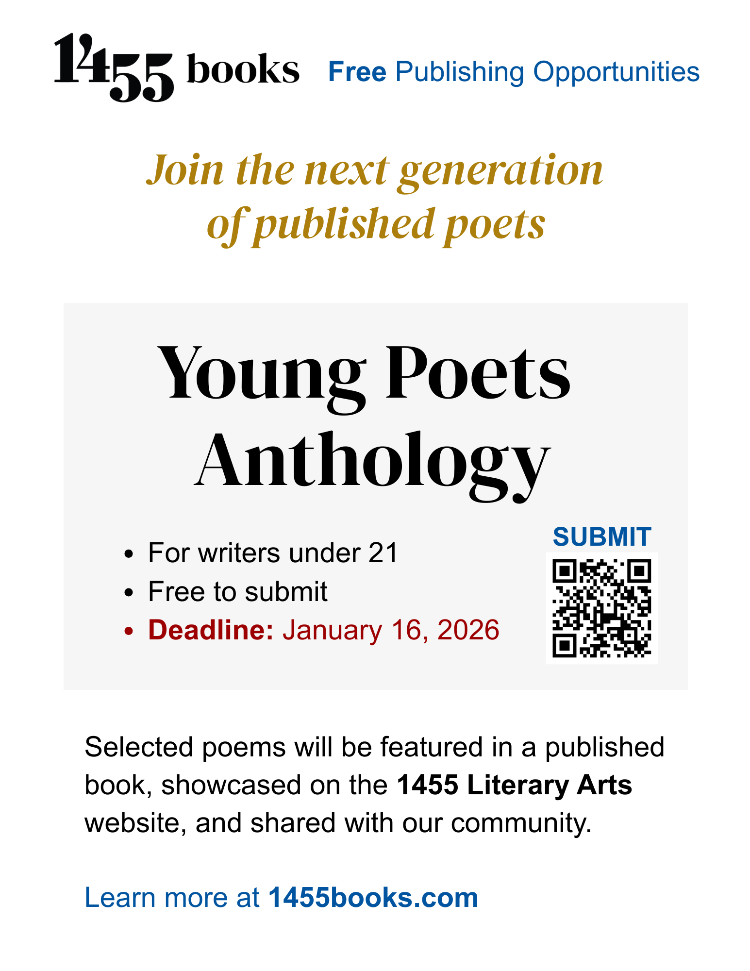 The inaugural 1455 Young Poets Anthology invites poets under 21 from around the world to share original work on the theme of HOPE—in all its complexity and possibility. The anthology seeks poems that imagine renewal, resilience, and connection in challenging times.